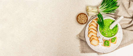 Pesto made from wild garlic, pine nuts and feta cheese in a glass, with fresh leaves on a dark textured background, empty space for text