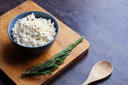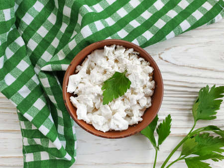 cottage cheese, parsley on a wooden background
