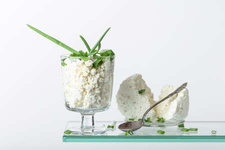 Cottage cheese with green onion in glass bowl on a white background. Copy space.