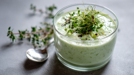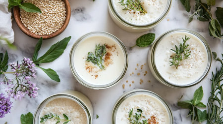 Delight in the freshness of herb-infused yogurt served in elegant glass jars, perfect for culinary creations and summer treats. Enjoy the flavors!