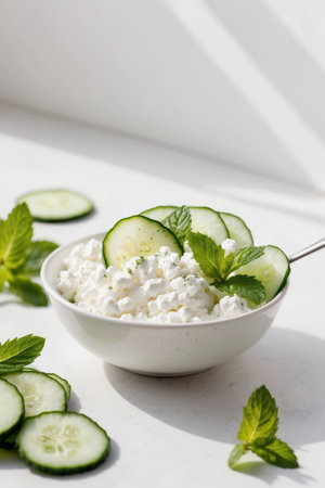 AI Generated. Creamy cottage cheese with cucumber and mint garnish