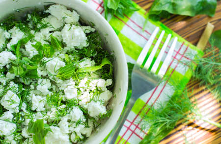 Fresh cottage cheese with spinach and herbs. Diet food