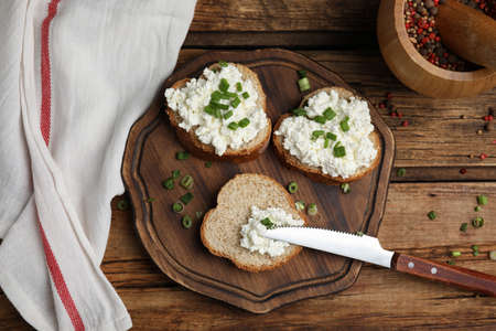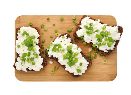 Slices of bread with cottage cheese and green onion. Shallow depth of field.