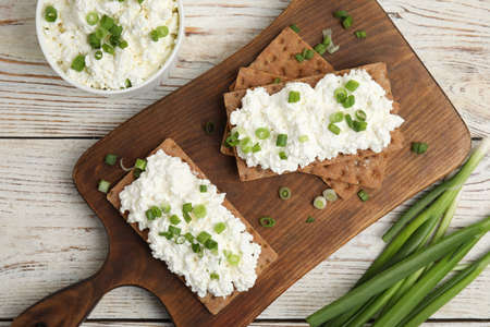 Crispy crackers with cottage cheese and green onion on white wooden table, flat lay