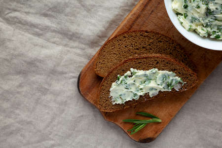 Rye bread on a wooden cutting board with curd cheese and ricotta and herbs.