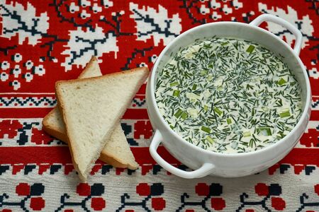 Summer light cold yogurt soup with cucumber, radish, eggs and dill on the table