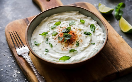 AI Generated. Creamy Sour Cream Dip with Fresh Herbs in Green Bowl