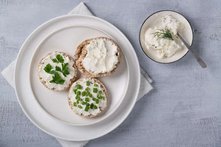 Curd sandwiches with fresh herbs. Crispbread toast with cottage cheese and green herbs. Concept proper snack. Copy Space for text