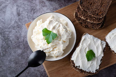 Curd cheese on a wooden cutting board with rye bread and herbs.