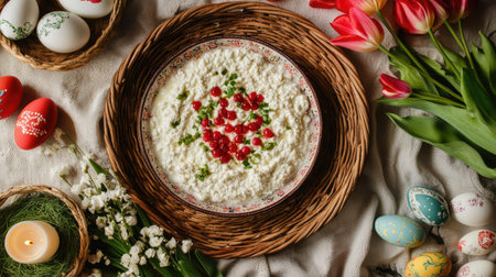 Traditional Easter Pashka cottage cheese dessert in a festive setting with tulips, candles, and a wicker basket of painted eggs