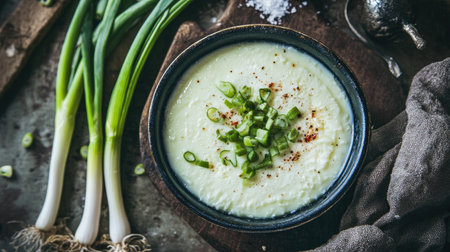 A creamy soup beautifully garnished with fresh green onions in a rustic bowl. Perfect for a cozy meal, this dish highlights fresh ingredients and comforting flavors.