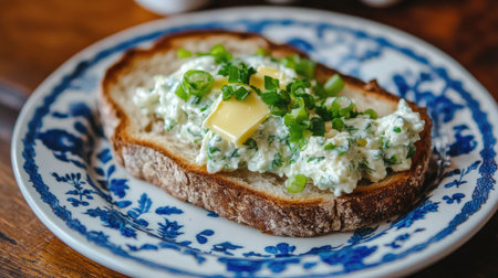A rustic slice of bread is topped with a creamy herb spread, garnished with fresh green onions and a pat of butter, perfect for a delightful meal.