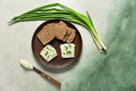 Plate with fresh bread, tasty cream cheese and green onions on light background