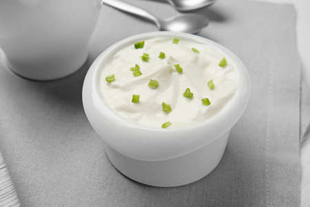 Bowl of tasty sour cream on table