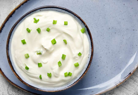 Sliced, chopped spring, salad, green onions or scallions with sour cream in a bowl on the white textured background