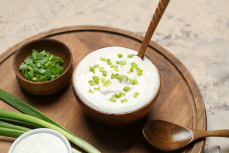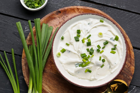 Fresh sour cream in bowl with green onions On a wooden background. Generative AI
