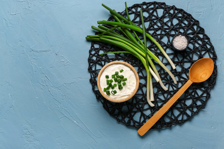 Bowl of tasty sour cream with green onion on blue background