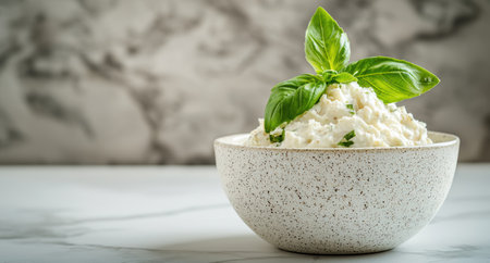 Overhead shot displays creamy cottage cheese with basil in bowl, complemented by crackers on a white surface. Food background for culinary creations.