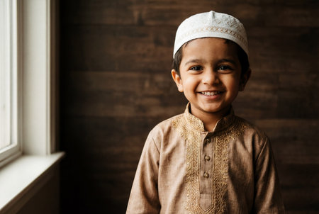 A cheerful young boy dressed in a light brown embroidered kurta and white skullcap stands near a window with soft natural light while smiling gently at the camera during a religious celebration.