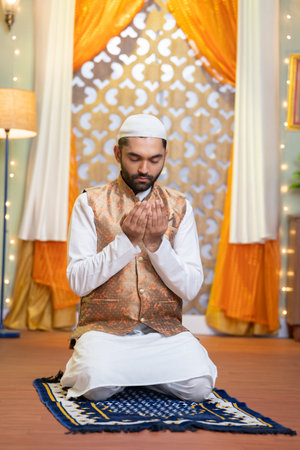 Vertical shot of young indian muslim man doing holy namaz or Salah at home during ramdan festival - concept tredition, culture and festive celebration.