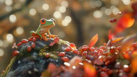 A vibrant tree frog perches on a moss-covered rock, surrounded by colorful autumn leaves and berries, creating a serene and enchanting natural scene.
