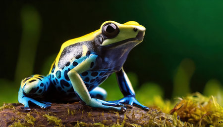Three poison dart frogs, showcasing vibrant blue and red colors, rest on a leaf in a humid jungle environment. Generative AI