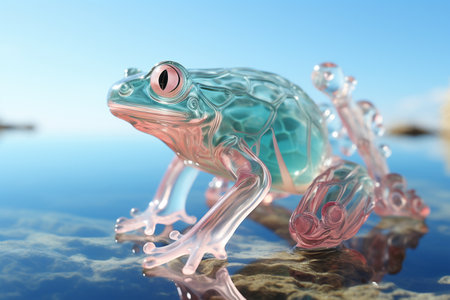 Colorful frog perched on a stone at the edge of water showing reflection in the water with dark background, generative ai