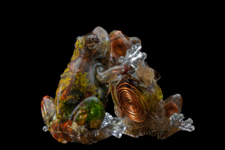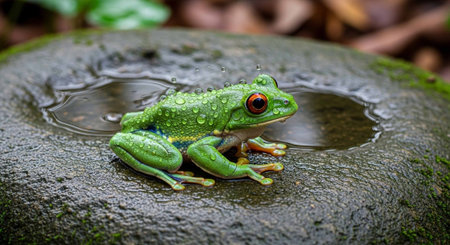 A wide-eyed frog perched on a sleek black rock, Ai-generated.