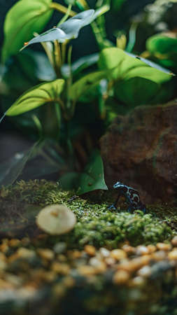 Close up of a blue frog, Dendrobates tinctorius Patricia, climb on a glass tank