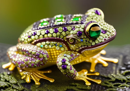 Golden frog covered with precious gems. Generative AI.