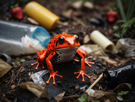 An AI generated illustration of A green amphibian is perched atop a pile of debris on the ground next to a group of metal garbage cans