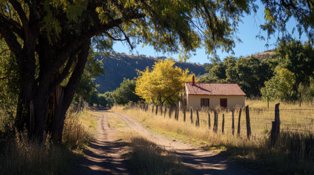 A serene countryside scene featuring a quaint cottage along a dirt road, surrounded by lush greenery and vibrant autumn trees under a clear blue sky.