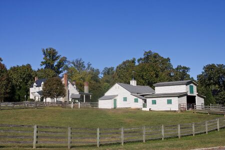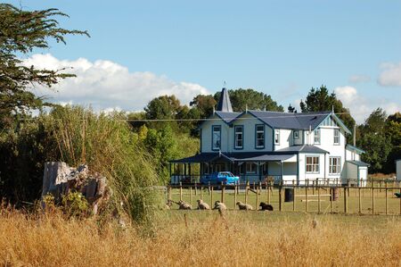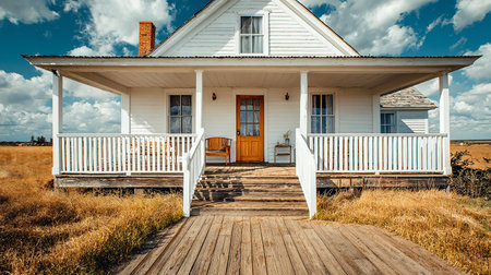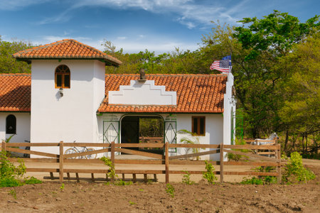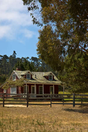 White farm house with red roof and wooden fence in the countryside.