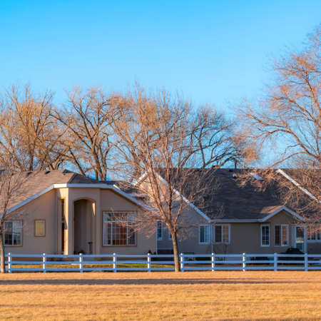 Vertical Charming houses and tall leafless trees under blue sky on a sunny day. The homes has a view of a vast grassy terrain on the other side of the white wooden fence.