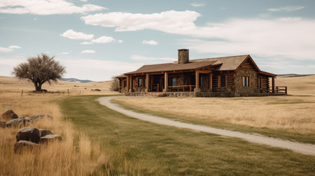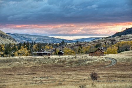 Serene rustic wooden home amidst okanagan valley s green pastures and majestic mountains at sunset