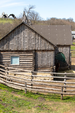 house with a wooden roof in the village against the blue sky