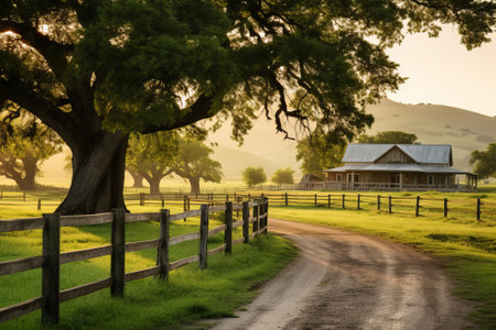 white picket fence extending along the ranch path, created with generative ai