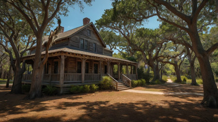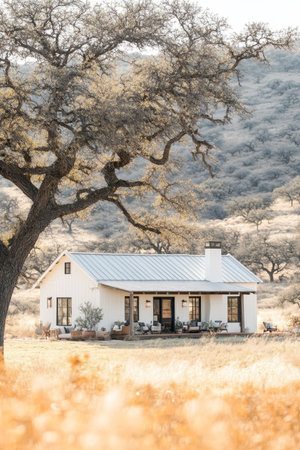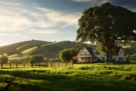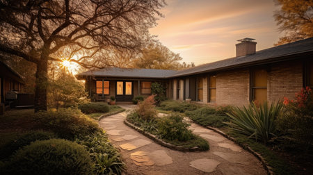 A picturesque house, surrounded by vibrant greenery, basking in the warm sunlight.