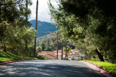 Scenic sunrise over modern mediterranean-style homes with lush green pathway.