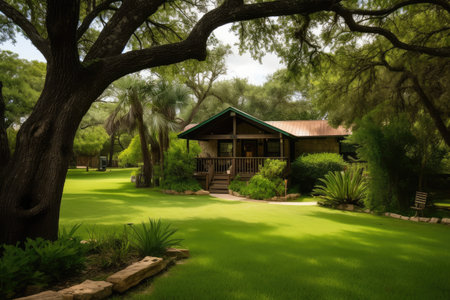 ranch house, surrounded by lush green lawn and garden, with wooden deck overlooking the property, created with generative ai