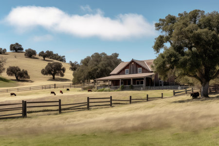 ranch house, with view of rolling hills and grazing livestock, created with generative ai