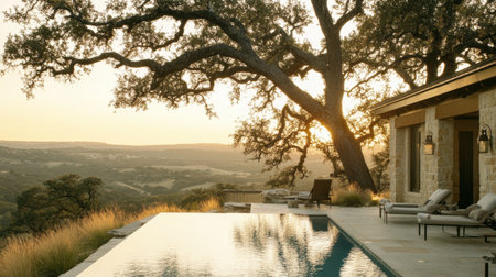 Experience the tranquility of a stunning poolside retreat nestled in a serene landscape, enhanced by a breathtaking sunset and lush greenery.