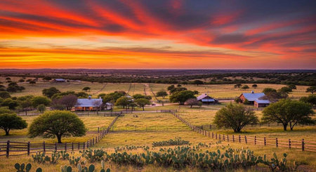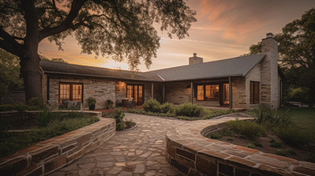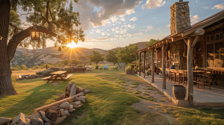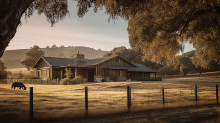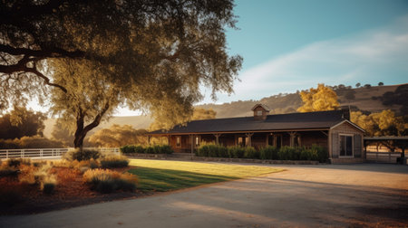 tranquil ranch house, with view of the sunset and rolling hills in the background, created with generative ai