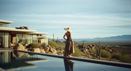 Young woman in a hat and dress standing on the edge of a swimming pool in a desert hotel