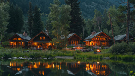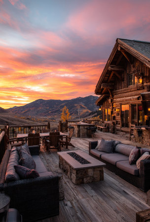 A wooden deck features seating arrangements and a fire pit, adjacent to a timber-framed cabin. The scene is bathed in the warm hues of a sunset, including vibrant orange, pink, and yellow. The style suggests a luxurious outdoor setting, potentially suitable for travel or lifestyle themes.