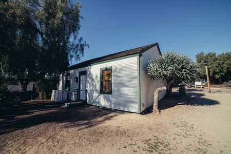 Old wooden house in the middle of the field at sunset. Vintage style.