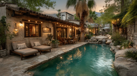 A stunning view of a desert oasis featuring a tranquil swimming pool surrounded by lush greenery and elegant seating, ideal for relaxation at sunset.