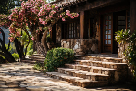 Home architecture design in Mediterranean Style with Courtyard constructed by Stucco, Clay roof tiles, Stone, Wood material. Influenced by Spanish heritage. Generative AI AIG25 .