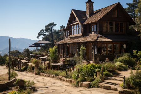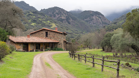 A picturesque rustic stone cottage surrounded by lush green hills and majestic mountains. The tranquil setting invites relaxation and appreciation of nature's beauty.