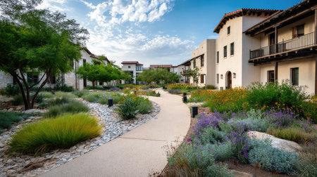 A picturesque scene showcasing a winding pathway through a lush garden at a modern residential complex, featuring colorful flowers and serene greenery.
